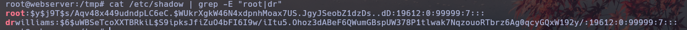 Como tal, no vemos nada relevante, sin embargo, estamos como root, podemos leer el /etc/shadow, vemos que hay un usuario llamado drwilliams y tiene un hash un tanto diferente. Vamos a tratar de romperlo con john