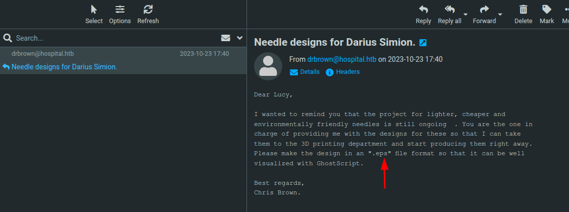 Logramos ganar acceso, y vemos que tenemos un mensaje de drbrown. Este nos dice que le enviemos información en un archivo .eps. Un archivo EPS (Encapsulated PostScript) es un formato de archivo gráfico vectorial estándar utilizado para almacenar ilustraciones y gráficos vectoriales.
