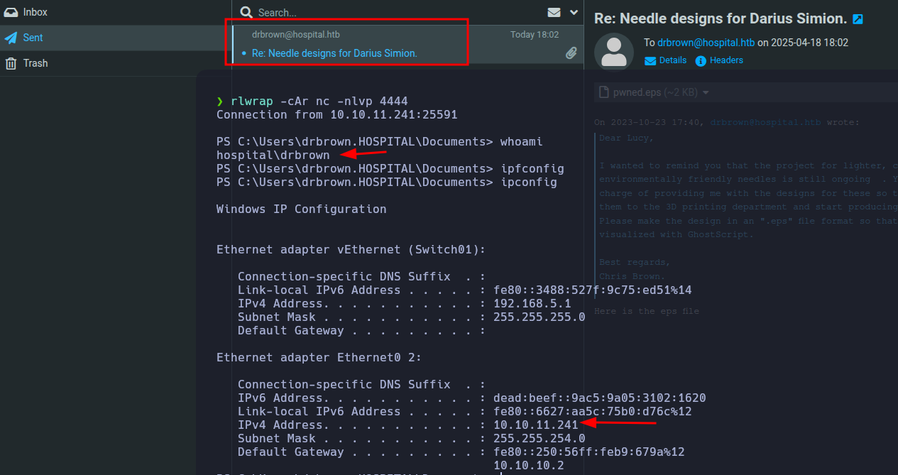 Nos crea un archivo malicious.eps y lo que hacemos es responder al correo de drbrown y adjuntarle en archivo, claro, y ponernos en escucha con nc para ver si se ejecuta el comando.